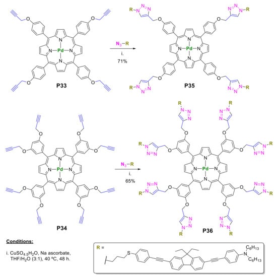 The synthesis of the Pd(II) porphyrin complexes P35 and P36 was described by Bretonniére and co-workers [36]. The synthetic strategy involved the preparation of the Pd(II) complexes P33 and P34 from the hydroxylated porphyrin precursors, followed by the functionalization of the metalloporphyrins with alkyne moieties by a nucleophilic substitution reaction with propargyl bromide in the presence of K2CO3. The next step involved the CuAAC reaction of P33 and the octa-substituted P34 alkynyl porphyrins with the azido-9,9-diethylfluorene derivative in the presence of CuSO4.5H2O and sodium ascorbate at 40 °C for 48 h. This allowed the preparation of the porphyrin derivatives P35 and P36 at a 71% and 65% yield, respectively (Scheme 12). The 9,9-diethylfluorene moiety grafted to the Pd(II) porphyrin acts as an artificial antenna enhancing the two-photon absorption when excited at 800 nm and induces an energy transfer to the porphyrin core through a Förster Resonance Energy Transfer (FRET) process [36].