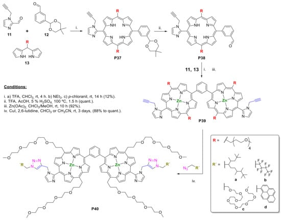 Satake and co-workers reported the preparation of the Gable-type porphyrin P39 bearing two imidazole-alkynyl moieties, thus becoming available to be modified via a CuAAC functionalization [37]. The A2BC porphyrin P37 was prepared by the condensation of dipyrromethane 13 with aldehydes 11 and 12 in the presence of trifluoroacetic acid (TFA), followed by acidic deprotection of the acetal protecting group thus affording the corresponding formyl derivative P38. Then, compound P38 was submitted to a further TFA catalyzed condensation with dipyrromethane 13 and aldehyde 11 under the same conditions affording the alkynyl porphyrin P39. Its Zn(II) complex was prepared by treatment with Zn(OAc)2 salt and functionalized through a CuAAC reaction with an alkyl, nonfluorinated, oligoether group and pyrene derivative moieties by the reaction of the appropriate azide in the presence of CuI and 2,6-lutidine (Scheme 13). Gable-type porphyrins P40 with a triazolyl bridge were obtained in high yields (>88%) after stirring for three days at room temperature. The authors emphasized the utility of the obtained porphyrin derivatives for the preparation of dynamic combinatorial chemistry leading to supramolecular systems by a self-assembly approach, capable of detecting interactions between a target biomaterial (e.g., proteins or nucleic acids) and a ligand [37].