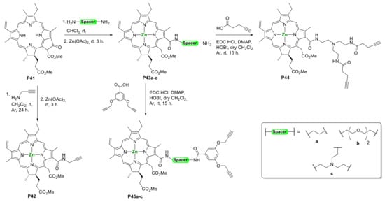 Methyl pheophorbide a P41 was used as the precursor for the synthesis of chlorin derivatives bearing one, two or four quinazoline moieties linked by triazolyl rings via CuAAC reactions (Scheme 14). In the first step, methyl pheophorbide a P41 reacted with propargylamine or a series of diamines affording the corresponding chlorin-amide derivatives P42 and P43 by exocyclic ring-opening; in the second step the free-base amide derivative was metalated with Zn(II). Finally, the Zn(II) chlorin-amide complexes P43a–c were submitted to an acylation reaction at the terminal free amino groups under Steligkich conditions that involved a carboxyl group (pent-4-ynoic acid or 3,5-bis(propargyloxy)benzoic acid), EDC, DMAP and HOBt. After 15 h at rt the corresponding amides P44 and P45 were obtained in yields ranging from 88% to 93% [38].