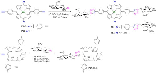 For instance, in 2015, Snyder and co-workers used the click conditions to prepare the glucosylated porphyrins P51 and P52 in very good yields by the direct conjugation of 2,3,4,6-tetra-O-acetyl-β-d-glucosyl-1-azide with the Zn(II) complexes of the adequate (4-ethynylphenyl)porphyrins P1-Zn and P50 (Scheme 16). The authors extended this approach to other per-O-acetylated sugar azides (galactose, lactose, and glucosamine) and referred that the use of the Zn(II) complexes was important to avoid the coordination of the porphyrin inner core with the copper ions present in click reactions [39]. In 2019, the same group extended the approach to the 5-(4-ethynylphenyl)porphyrin, 5-(4-ethynylphenyl)-10,15,20-triphenylporphyrin, 5,15-bis(4-ethynylphenyl)-10,20-diphenylporphyrin, 2-ethynyl-5,10,15,20-tetraphenylporphyrin [40]. This group also used click chemistry to prepare three reduced glycosylated macrocycles (e.g., P54) by direct conjugation of the per-O-acetylated sugar azides (glucose, galactose and lactose) with 5-ethynyl-15-methoxy-7,7,17,17-tetramethyl-2,12-bis(p-tolyl)bacteriochlorin (P53) as shown in Scheme 16 for P54.