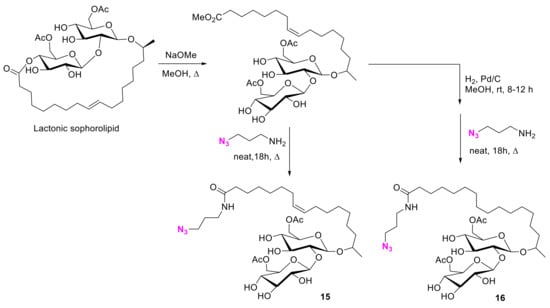 Other research groups searching for bio-based molecules for supramolecular self-assembly into functional materials for electro-optical applications were able to conjugate, through the CuAAC approach, glycolipid surfactants’ moieties such as 15 and 16 with 5,10,15,20-tetrakis(4-ethynylphenyl)porphyrin P1-Zn. These azide glycolipid surfactants (15 and 16) were prepared by ring-opening of lactonic sophorolipids followed by reaction with 3-azidopropylamine under neat reaction conditions (15) (Scheme 17). Since the double bond confers a certain degree of rigidity that influences the self-assembly of the corresponding functional material, the catalytic hydrogenation step was performed before the reaction with 3-azidopropylamine affording derivative 16 with a good yield (>60%) [41].