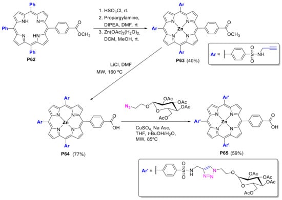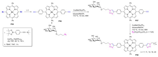Senge and co-workers used the bis(4-ethynylphenyl)porphyrin derivative P56 to prepare amphiphilic target molecules P58 to be used in PDT (Scheme 18) [42]. In this study, the authors used the 3-azidopropyl α-d-mannopyranoside as the carbohydrate component. Starting from 5,15-dibromo-10,20-diphenylporphyrin P55, the ethynyl derivative P56 was prepared with a 72% yield via a Suzuki cross-coupling reaction using 4-[(trimethylsilyl)ethynyl]phenylboronic acid pinacol ester, K3PO4, Pd(PPh3)4 in THF at 65 °C for 16 h (Scheme 18). The click reaction between a large excess of the ethynyl porphyrin P56 and the azide sugar compound afforded the monosubstituted derivative P57 after 10 min at 115 °C under microwave irradiation. Following a similar approach, the second ethynyl group was then grafted with different azidoalkyl chains N3CH2(CH2)nCH3 (n = 7–20). Two of the prepared compound P58 (n = 7 and 16) exhibited singlet oxygen production similar to Foscan.