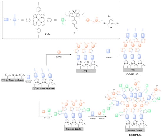 - Topka, M.R.; Dinolfo, P.H. Synthesis, Characterization, and Fluorescence Properties of Mixed Molecular Multilayer Films of BODIPY and Zn(II) Tetraphenylporphyrins. ACS Appl. Mater. Interfaces 2015, 7, 8053–8060. [Google Scholar] [CrossRef]
