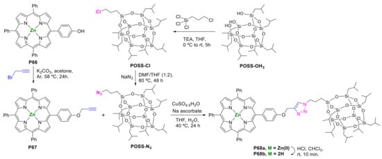 - Liu, F.; Zhang, Y.; Xu, L.; Zhang, W. Morphology-Controlled Self-Assembly of an Organic/Inorganic Hybrid Porphyrin Derivative Containing Polyhedral Oligomeric Silsesquioxane (POSS). Chem. Eur. J. 2015, 21, 5540–5547. [Google Scholar] [CrossRef]