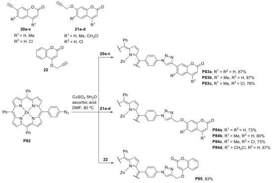- Singh, D.K.; Nath, M. Synthesis and photophysical properties of β-triazole bridged porphyrin–coumarin dyads. RSC Adv. 2015, 5, 68209–68217. [Google Scholar] [CrossRef]