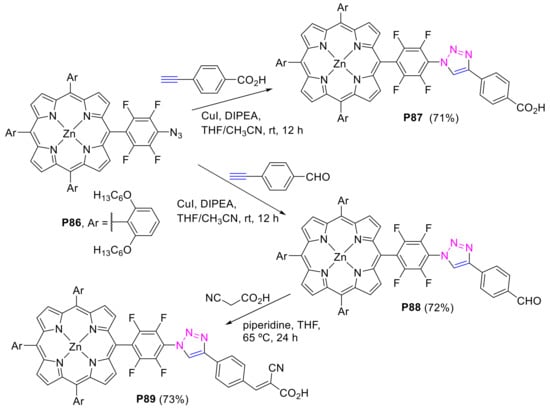 - Nikolaou, V.; Angaridis, P.A.; Charalambidis, G.; Sharma, G.D.; Coutsolelos, A.G. A “click-chemistry” approach for the synthesis of porphyrin dyads as sensitizers for dye-sensitized solar cells. Dalton Trans. 2015, 44, 1734–1747. [Google Scholar] [CrossRef]