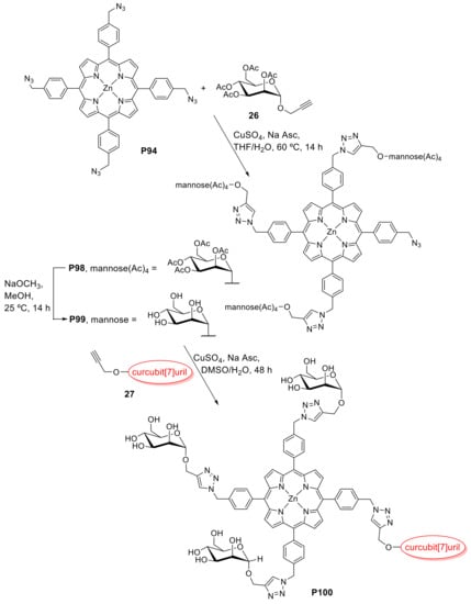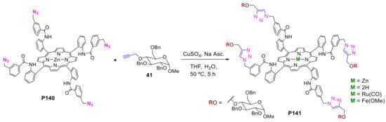 The click approach was also used to prepare porphyrin-carbohydrate conjugates. In most of the strategies reported, the alkynyl function is present in the porphyrin while the azide group appears in the carbohydrate component.