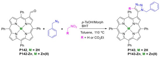 Photophysical studies with the former products have revealed that derivative P14b showed a temperature-dependent intramolecular binding between the 1,2,3-triazole moieties and Zn(II)-porphyrin core. These intramolecular interactions are favored at low temperature; however, at higher temperatures, the Zn(II) porphyrin-triazole coordination is broken and the molecules adopt an open flower-type conformation. The intramolecular coordination can be avoided by the addition of an external chemical stimulus, such as 1-phenylimidazole, a stronger ligand when compared with 1,2,3-triazole moieties [24].
