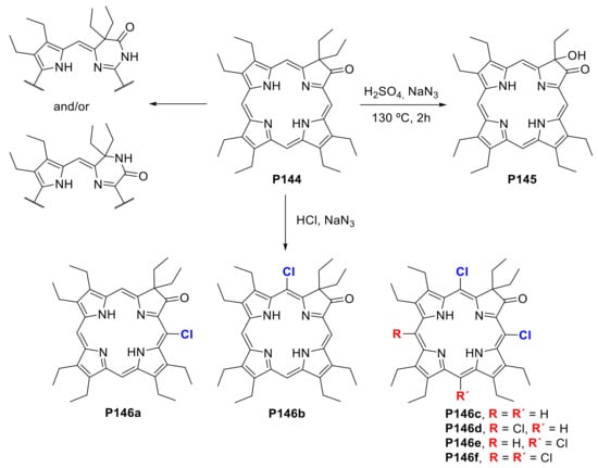 - Li, R.; Zeller, M.; Bruhn, T.; Brückner, C. Surprising Outcomes of Classic Ring-Expansion Conditions Applied to Octaethyloxochlorin, 3. Schmidt-Reaction Conditions. Eur. J. Org. Chem. 2017, 2017, 1835–1842. [Google Scholar] [CrossRef]