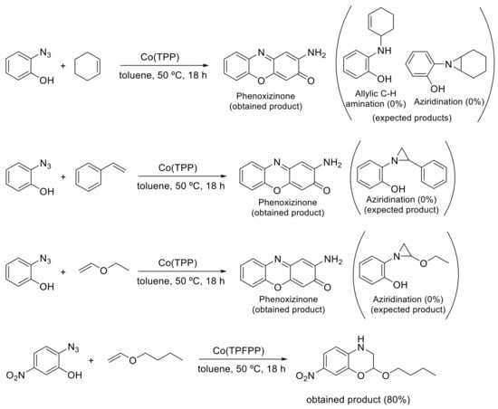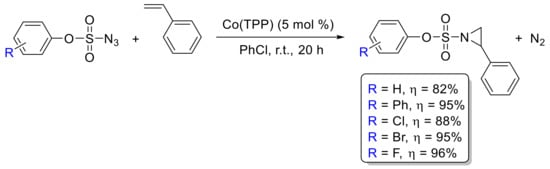 - Subbarayan, V.; Jin, L.-M.; Cui, X.; Zhang, X.P. Room temperature activation of aryloxysulfonyl azides by [Co(II)(TPP)] for selective radical aziridination of alkenes via metalloradical catalysis. Tetrahedron Lett. 2015, 56, 3431–3434. [Google Scholar] [CrossRef] [PubMed]