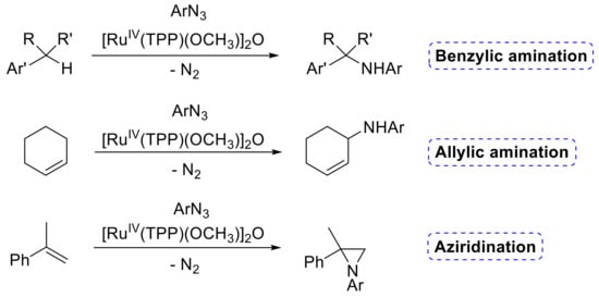 - Intrieri, D.; Carminati, D.M.; Gallo, E. Recent advances in C–H bond aminations catalyzed by ruthenium porphyrin complexes. J. Porphyr. Phthalocyanines 2016, 20, 190–203. [Google Scholar] [CrossRef]