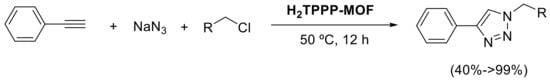 - Jiang, W.; Yang, J.; Liu, Y.-Y.; Ma, J.-F. Porphyrin-based mixed-valent Ag(I)/Ag(II) and Cu(I)/Cu(II) networks as efficient heterogeneous catalysts for the azide–alkyne “click” reaction and promising oxidation of ethylbenzene. Chem. Commun. 2016, 52, 1373–1376. [Google Scholar] [CrossRef]