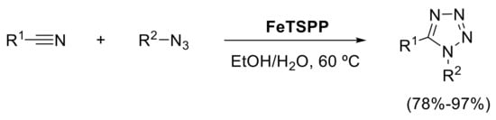 - El-Remaily, M.A.E.A.A.A.; Elhady, O.M. Iron (III)-porphyrin Complex FeTSPP as an efficient catalyst for synthesis of tetrazole derivatives via [2 + 3]cycloaddition reaction in aqueous medium. Appl. Organometal. Chem. 2019, 33, e4989. [Google Scholar] [CrossRef]