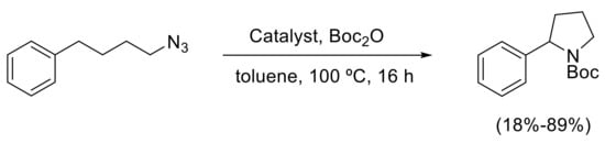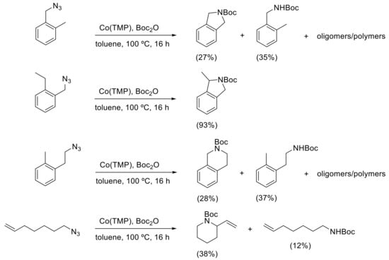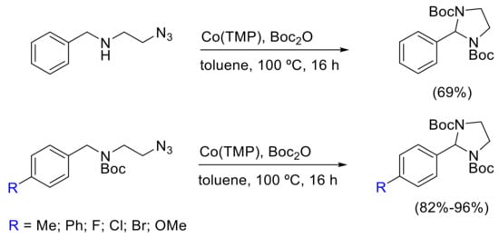 - Kuijpers, P.F.; Tiekink, M.J.; Breukelaar, W.B.; Broere, D.L.J.; van Leest, N.P.; van der Vlugt, J.I.; Reek, J.N.H.; de Bruin, B. Cobalt-Porphyrin-Catalysed Intramolecular Ring-Closing C-H Amination of Aliphatic Azides: A Nitrene-Radical Approach to Saturated Heterocycles. Chem. Eur. J. 2017, 23, 7945–7952. [Google Scholar] [CrossRef] [PubMed]