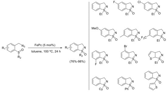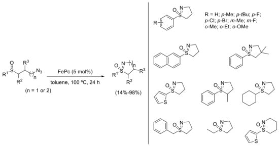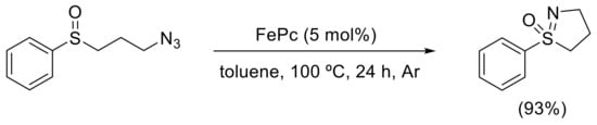 - Yu, H.; Li, Z.; Bolm, C. Three-Dimensional Heterocycles by Iron-Catalyzed Ring-Closing Sulfoxide Imidation. Angew. Chem. Int. Ed. 2018, 57, 12053–12056. [Google Scholar] [CrossRef] [PubMed]