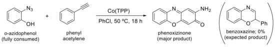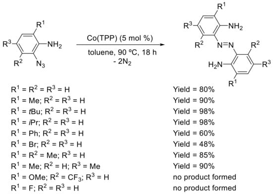 - Goswami, M.; Bruin, B.D. Porphyrin Co(III)-Nitrene Radical Mediated Pathway for Synthesis of o-Aminoazobenzenes. Molecules 2018, 23, 1052. [Google Scholar] [CrossRef] [PubMed]