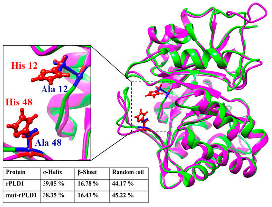 Superimposition of the structure of rPLD1 with the structure of mut-rPLD1. The backbone of rPLD1 is presented as pink and for mut-rPLD1 as green. Both structures have TIM β/α Barrel fold and show evidence of high structural homology. In the magnified close-up view (left) the His12 and His48 of rPLD1 are shown in red and Ala12 and Ala48 of mut-rPLD1 in blue. The percentages of the secondary structures are depicted in inserted table.