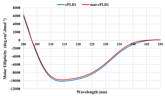 Circular dichroism spectra for the rPLD1 and mut-rPLD1. Spectra were collected using proteins in 1X PBS, pH 7.4, at 25 °C. Molar Ellipticity was studied in a wavelength range from 190 to 250 nm.