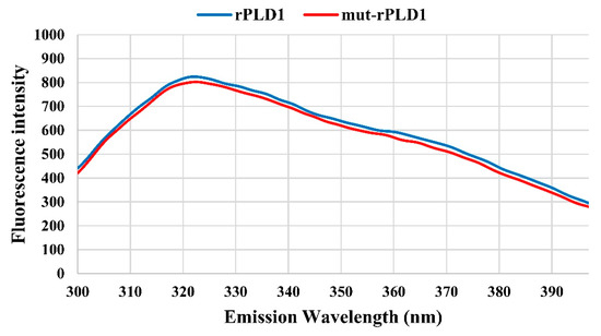 For analyzing protein folding and three-dimensional structure studying, the steady-state fluorescence spectra of both rPLD1 and mut-rPLD1 were carried out with Perkin-Elmer LS 50B luminescence spectrometer (Perkin Elmer, Mundelein, IL, USA) in a 1.0 cm length quartz cell. The concentration of both proteins was adjusted to 50 µg/mL in phosphate buffer at pH 7.4 and the measurements were done at 25 °C. The excitation wavelength for monitoring intrinsic (tryptophan) fluorescence was 280 nm and excitation slit was 10 nm. The spectra then were collected ranging from 300 to 400 nm with emission slit of 5 nm