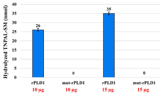 Sphingomyelinase activity of rPLD1 and mut-rPLD1. The substrate TNPAL-SM was incubated with different amounts (10 and 15 µg) of both rPLD1 and mut-rPLD1. As illustrated here, the quantity of the rPLD1 activity is dose-dependent but mut-rPLD1 lacks any enzymatic activity in any dose. 1 nmol of hydrolyzed TNPAL-SM corresponds to 0.023 absorbance units.
