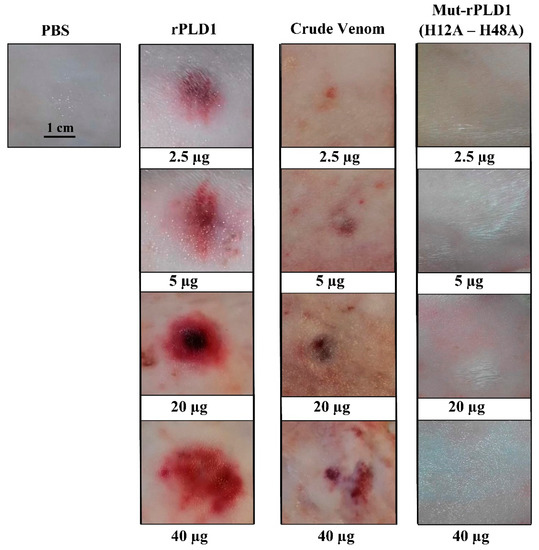 Dermonecrotic test in rabbit skin. Macroscopic visualization of skin lesions by intradermal injection of 2.5, 5, 20 and 40 µg of rPLD1, crude venom and mut-rPLD1 at 24 h post-injection. As displayed here, both rPLD1 and CV affect clear dermonecrotic lesions, however mut-rPLD1 has no dermonecrotic effect on rabbit skin. Phosphate buffered saline (PBS) was injected as negative control.