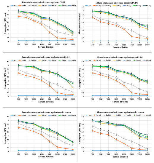 This ELISA assay was carried out in six series according to which of the antigens (rPLD1, mut-rPLD1 or crude venom) has been coated inside the wells and also based on the sera received either from the mice immunized with Freund’s adjuvant or alum adjuvant as following: anti-toxoid sera from mice immunized with toxoid-Freund’s adjuvant in 1st run against rPLD1 (as explained above), in 2nd run against mut-rPLD1, 3rd run against crude venom; and so in regard to the antisera from mice immunized with toxoid-Alum adjuvant in 4th run against rPLD1, in 5th run against mut-rPLD1 and in 6th run against crude venom was performed.
