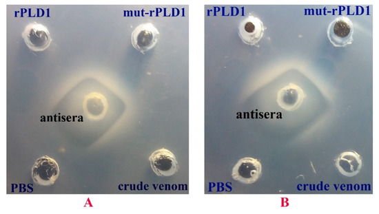 Ouchterlony tests. (A) Cross-Reactivity of IgG in the antisera of Freund’s-immunized mice with rPLD1, mut-rPLD1 and Crude venom led to formation of the precipitin lines without any spur that strongly indicates that there is a full identity between all three antigens. (B) The same cross-reactivity was applied for Alum-immunized mice. PBS was used as negative control.