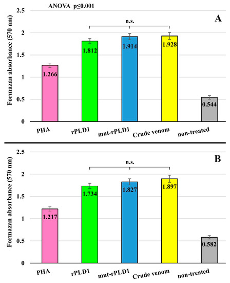 Conventional MTT assay was performed by absorption at 570 nm in regard to 4 groups of splenocytes treated with PHA, rPLD1, mut-rPLD1 and crude venom after 24 h post-treating. Non-treated group absorbance collection was done as negative group. (A) Assay was performed on Freund-immunized mice. (B) Assay was performed on Alum-immunized mice.
