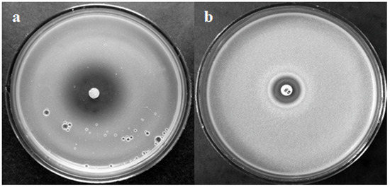 Inhibition of C. parapsilosis growth by Rh. tomentosum essential oil (EO) (8 Sh) (a) and nystatin (b).