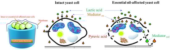 Instead of agar disc assay, mediated amperometry was used as an alternative. The effect of the essential oil on the yeast membrane permeability was monitored by measuring potassium ferricyanide-mediated current responses to lactic acid at yeast-modified electrodes treated with vapors of EO (a schematic image of amperometric measurements is presented in Figure 2).