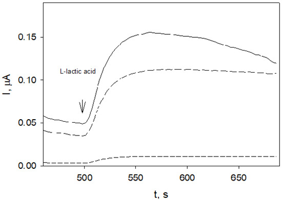 Obviously higher current responses at affected electrodes (Figure 3, solid and medium-dashed lines) compared to that obtained at a non-affected electrode (Figure 3, short-dashed line) indicated the increase in membrane permeability to lactic acid and/or mediator K3[Fe(CN)6].