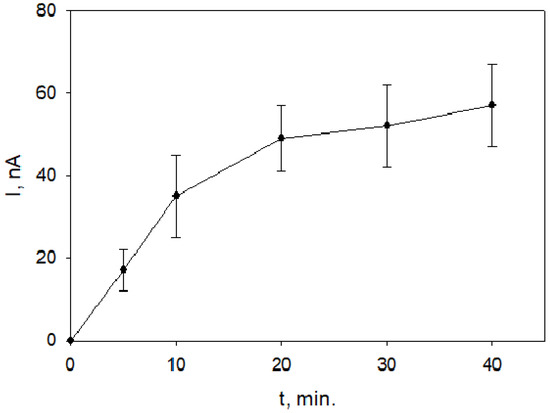 Dependence of yeast-modified electrode responses to 0.2 mmol/L L-lactic acid on the time of electrode subjection to vapors of Rh. tomentosum EO (8 Sh), phosphate buffer pH 7.3 contained 0.5 mmol/L K3[Fe(CN)6]; operating potential 0.3 V.