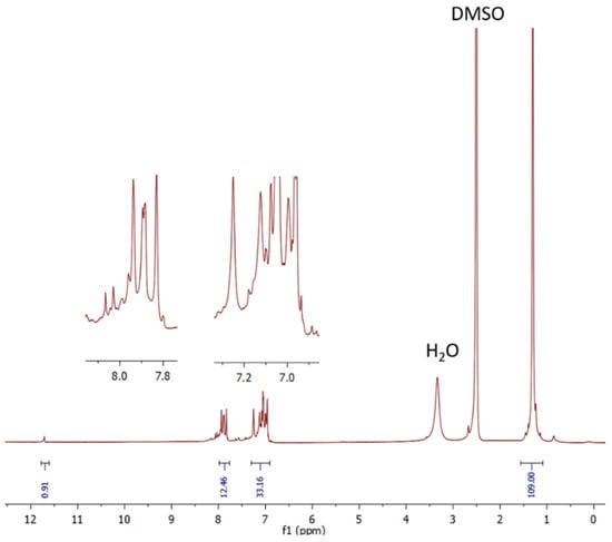 Tri-tert-butylcarbazolyl-carboxylphthalocyaninatozinc(II) (tCzZnPc1): Zinc oxide (0.4 mg, 0.004 mmol) and potassium hydroxide (2.8 mg, 0,04 mmol) were placed in an oven-dried tube, which was placed in a Radley carousel. The tube was subjected to vacuum and then filled with nitrogen gas (repeated three times). Vacuum was applied again, and the carousel heated to 170 °C for 1 h. Subsequently, the tube was refilled with nitrogen gas. Anhydrous and degassed mesitylene (2 mL) was added and the mixture heated to reflux. 3 (0.02 mmol, 40 mg) that previously was dissolved in degassed mesitylene (1 mL) was added dropwise by syringe, and the reaction was refluxed with stirring under a flow of nitrogen for 24 h. The mixture was cooled down to room temperature and the mesitylene was evaporated under vacuum. The precipitate was acidified with 16% aqueous hydrochloric acid. The aqueous layer was extracted with ethyl acetate (3 × 5 mL). The combined organic layers were dried over sodium sulfate and concentrated in vacuum to give tCzZnPc1 as a pure compound (36 mg, 92%). m.p. > 300 °C; 1H NMR (400 MHz, DMSO-d6) δ = 11.72 (s, 1H), 7.96–7.76 (m, 12H), 7.32–6.92 (m, 33H), 1.30 (brs, 109H). 13C NMR (100 MHz, DMSO-d6) δ = 168.4, 143.3, 139.1, 138.2, 137.8, 132.8, 127.4, 124.0, 123.8, 123.4, 123.2, 109.5, 34.7, 32.1 ppm. UV-Vis (THF) λmax (nm) (log ε(dm3 mol−1 cm−1)): 707 (3.7), 355 (4.5 sh). MS (MALDI-TOF, DHB on ground steel plate): m/z: 2285.74.