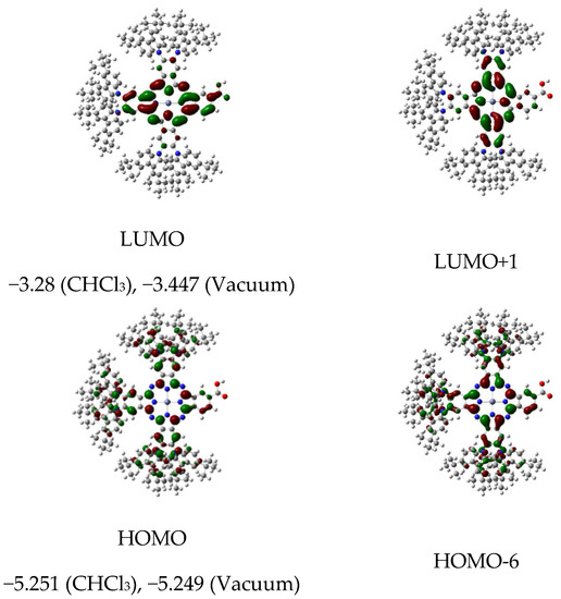 The Gouterman’s molecular orbitals of tCzZnPc1 calculated at CAM-B3LYP/LANL2DZ level of theory, and the calculated values of HOMO and LUMO energy levels in a vacuum and in CHCl3.