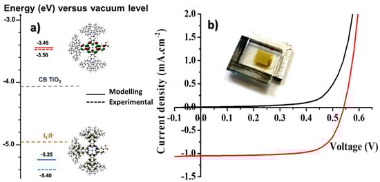 (a) Energy band diagram of the DSSC fabricated in this work. (b) Current–voltage curves of an opaque tCzZnPc1-based device recorded in the dark (black line) and under irradiation (red line) under AM 1.5G (1000 W·m−2) irradiation condition.
