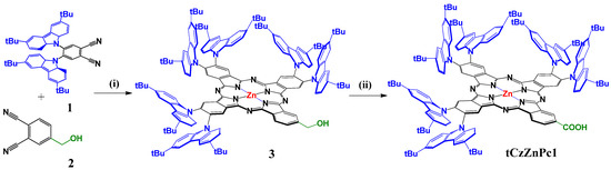 Synthetic route to peripherally substituted A3B tCz-ZnPc with carboxylic anchoring group (i) Zn(AcO)2, DMAE, reflux (ii) ZnO, KOH, mesitylene, reflux.