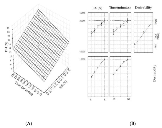 (A) Response surface for the dependent variable “degree of hydrolysis”. (B) Desirability graph of the degree of hydrolysis. DH (%), degree of hydrolysis; E:S (%), enzyme to substrate ratio; Time (minutes), hydrolysis time.