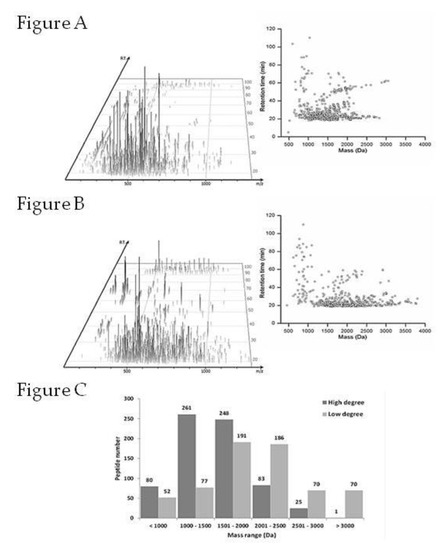 Comparison of derived peptide profiles from the different degrees of hydrolysis. 3D LC-MS showing distribution of ion peak (m/z × retention time × intensity) followed by characteristics of the identified peptides in the homology search according to molecular weight (MW) in high degree (A) and low degree (B) hydrolysis processes. Identified peptides number distribution according to MW range in each hydrolysate (C).