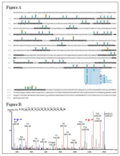 A higher number of prolines present in chicken comb/wattles peptides were found with hydroxylation modification (hydroxyproline—Pro +15.99 Da) and some with motif Gly-Pro-Hyp like sequences GLP(+15.99)GPIGP(+15.99)P(+15.99)GPR and GPP(+15.99)GPSGPPGKDGRN (Figure 6). Protein hydrolysates produced from collagen-rich materials like skin gelatin have been reported to display antioxidant activity and particularly those having the repeating motif Gly-Pro-Hyp, found in the hydrolysates of the present chicken comb/wattles [12].