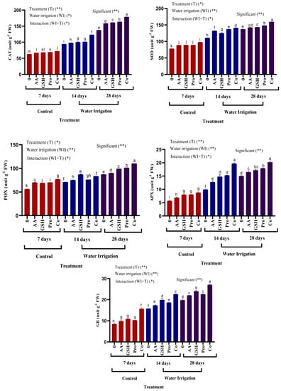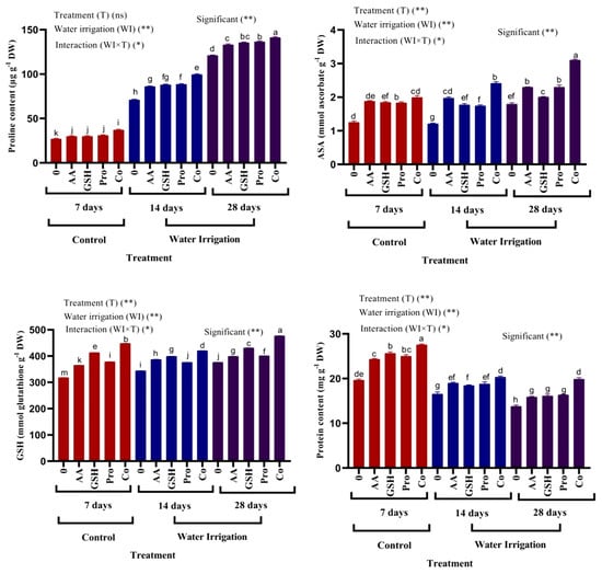 El-Beltagi, H.S.; Mohamed, H.I.; Sofy, M.R. Role of Ascorbic acid, Glutathione and Proline Applied as Singly or in Sequence Combination in Improving Chickpea Plant through Physiological Change and Antioxidant Defense under Different Levels of Irrigation Intervals. Molecules 2020, 25, 1702. https://doi.org/10.3390/molecules25071702