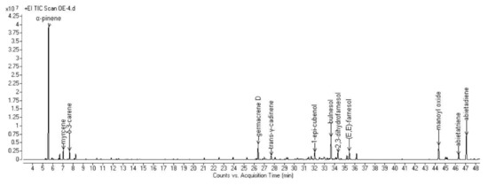 | Monoterpene hydrocarbons | 75.7 | 6.5 | 59.6 | 46.3 | 4.0 | 2.4 | |