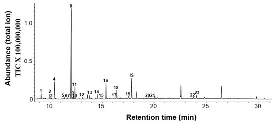 Gas chromatograph (GC) profile of floral volatile emission in C. florida ‘Kaiser’ at the full blooming stage. Separation of volatile compounds was performed on an Agilent HP 5 MS capillary column. Compounds identified from floral volatile blend are labeled with 1–23. (1) 2-Hydroxyethyl methacrylate, (2) Limonene, (3) Benzyl alcohol, (4) 2-Phenylacetaldehyde, (5) trans-Linalool oxide, (6) 3-Carene, (7) Linalool, (8) 5-Caranol, (9) Nonanal, (10) 6-Ethenyldihydro-2,2,6-trimethyl-2H-pyran-3(4H)-one, (11) Phenylethyl alcohol, (12) Benzyl cyanide, (13) 1,4-Dimethoxybenzene (14) 2-(2-Butoxyethoxy)ethanol), (15) Decanal, (16) 2-Phenoxyethanol, (17) Phenylacetaldoxime, (18) 2-Phenylethylacetate, (19) 2-Phenylnitroethane, (20) Tetradecane, (21) 1,3,5-Trimethoxybenzene, (22) 2,6,10,15-Tetramethylheptadecane, (23) Nerolidol. IS represents the internal standard.