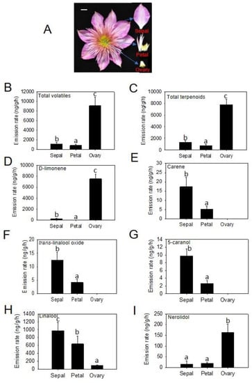 Ovaries showed the highest rates of total emission (8936.55 ± 1703.16 ng h−1g−1) among the three tissues. The emission rate of total volatiles from ovaries was about six times higher than that from sepals and 11 times higher than that from transformed-petals (Figure 2B). Among the three tissues, ovaries also showed the highest rates of emission for individual chemical classes: 7793.14 ± 899.32 ng h−1g−1 for terpenoids, (Figure 2C), 710.08 ± 121.64 ng h−1g−1 for benzenoids, 224.71 ± 37.45 ng h−1g−1 for fatty acid derivatives, and 177.26 ± 23.08 ng h−1g−1 for nitrogenous volatiles. As for individual terpenes, limonene (7532.29 ± 839.18 ng h−1g−1) and nerolidol (163.52 ± 38.95 ng h−1g−1) exhibited the highest rates of emission from ovaries (Figure 2D,I). In contrast, carene, trans-linalool oxide, 5-caranol, and linalool showed the highest rates of emission from sepals (Figure 2E–H).