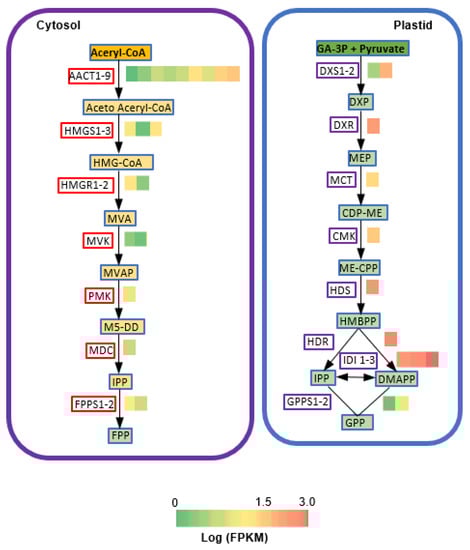 Representative terpenoid biosynthesis pathways with cognate heat maps for transcript levels of genes from C. florida ‘Kaiser’ transcriptome data with substrates and products. Green/red color-coded heat maps represent relative transcript level calculated with fragments per kilobase of transcripts per million mapped fragments (FPKM). Abbreviations of enzymes: AACT, acetyl-CoA C-acetyltransferase; HMGS, hydroxylmethylglutaryl-CoA synthase; HMGR, hydroxymethylglutaryl-CoA reductase (NADPH); MVK, mevalonate kinase; PMK, 5-phospho-mevalonate kinase, MDC, mevalonate diphosphate decarboxylase; FPPS, farnesyl pyrophos-phate synthase; DXS, 1-deoxy-d-xylulose-5-phosphate synthase; DXR, 1-deoxy-d-xylulose-5-phos-phate reductoisomerase; MCT, 2-C-methyl-d-erythritol 4-phosphate cytidylyltransferase; CMK, 4-diphosphocytidyl-2-C-methyl-d-erythritol kinase; HDS, (E)-4-hydroxy-3-methylbut-2- enyl diphosphate synthase; HDR, 4-hydroxy-3-methylbut-2-enyl diphosphate reductase; IDI, isopentenyl-diphosphate delta-isomerase; GPPS, geranyl diphosphate synthase. Compound abbreviations: HMG-CoA, 3-hydroxy-3-methylglutaryl-CoA; MVA, mevalonate; MVAP, 5-phosphomevalonate; M5-DD, 5-pyrophosphomevalonate; FPP, (E,E)-farnesyl pyrophosphate; DXP, 1-deoxy-d-xylulose 5-phosphate; MEP, 2-C-methyl-d-erythritol 4-phosphate; CDP-ME, 2-C-Methyl-d-erythritol-2,4-cyclodiphosphate; ME-CPP, 2-C-methyl-d-erythritol-2,4-cyclodiphosphate; HMBPP, 1-hydroxy-2-methyl-2-(E)-butenyl-4-diphosphate; IPP, isopentenyl pyrophosphate; DMAPP, dimethyallyl pyrophosphate; GPP, geranyl pyrophosphate.