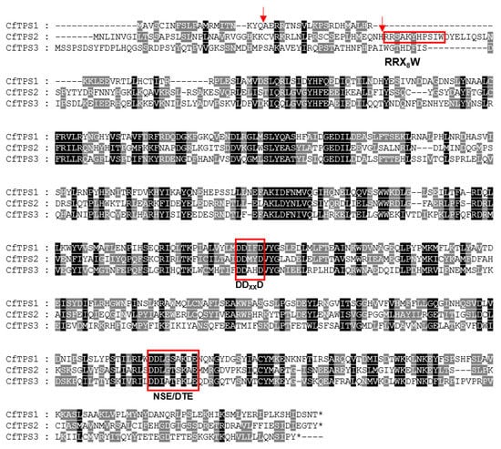 Next, the transcriptome of ‘Kaiser’ flowers was specifically searched for TPS genes. Three putative full-length intact TPS genes were identified. They were designated CfTPS1, CfTPS2, and CfTPS3. The proteins they encode are 554 (CfTPS1), 586 (CfTPS2), and 591 (CfTPS3) amino acids in length. A sequence alignment revealed that all of the CfTPS proteins contained the conserved ‘DDXXD’ and ‘NSE/DTE’ motifs that are essential for the binding of the co-factors Mg2+ or Mn2+ to catalyze terpene biosynthesis [19].