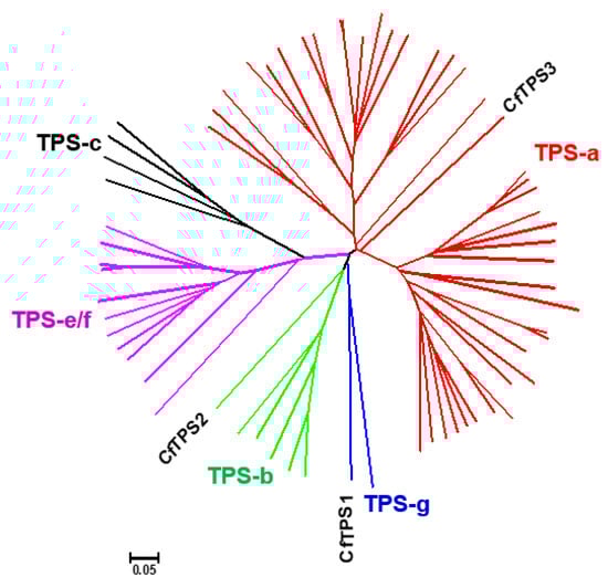 Phylogenetic analysis of three CfTPS and selected terpene synthases (TPSs) from the dicot Arabidopsis thaliana and the monocot Oryza sativa based on estimation of pair-wise distances at the amino acid level. Clusters corresponding to five TPS subfamilies (TPS-a, TPS-b, TPS-c, TPS-g, and TPS-f) are apparent. The genes belonging to the TPS-a, TPS-b, TPS-c, TPS-g, and TPS-e/f subfamilies were color-coded in red, green, black, blue, and purple, respectively. The Clustal W 2.0 algorithm was used for the alignment. Trees were inferred with the neighbor-joining (NJ) method and n = 1000 replicates for bootstrapping.