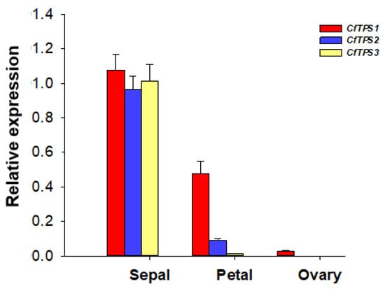 To further assess the role of CfTPS genes in floral volatile biosynthesis, the expression of the three CfTPS genes in three different floral organs (sepals, transformed-petals, and ovaries) were measured by reverse transcription quantitative PCR (RT-qPCR). All three CfTPS genes were expressed in sepals and transformed-petals with higher levels of expression detected in sepals (Figure 7).