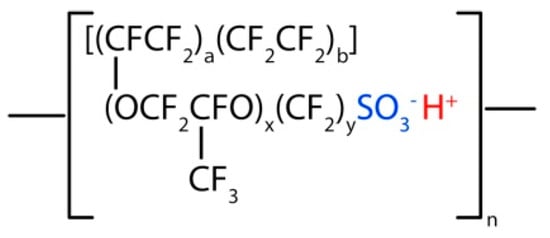 Nafion is a fluoropolymer made by sulfonated polytetrafluorethylene introduced by DuPont in the mid-1960s. It is commercially available with a thickness between 25 and 250 µm. As for Teflon, its structure (Figure 1) consists of CF2 (difluorocarbene) radicals, alternated to CFOCF2 and with end chains of sulfonic acid SO2OH.