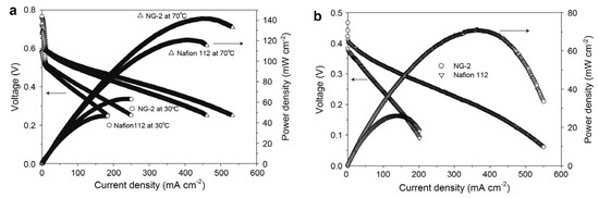 Graphene oxide has an excellent compatibility with Nafion so it can be adopted as a modifier to improve the selectivity (to allow the passage of specific species) and performance of such membranes. Choi, et al. [98] developed a composite GO/ Nafion membrane. The authors claimed that the compatibility between both components was guaranteed due to their strong interfacial attraction. GO enhanced thermal backbone and side chains stabilities due to the interaction between GO sheets and Nafion: the non-polar backbone of Nafion interacted with the hydrophobic structure of GO while the polar ionic clusters of Nafion with the hydrophilic groups of GO. Their study revealed that the permeability for methanol with just 0.5 wt.% of GO was reduced to 60.2% of Nafion 112 at 25 °C. However, the proton conductivity tests revealed an opposite trend showing a decrease with increasing the GO filler content and a loss of 55.3% in proton conductivity is reported with 2 wt. % GO loading. This was not completely unexpected as GO alone is not known to be an excellent proton conductor. The authors obtained the maximum power density of 62 mW cm−2 at 30 °C and 141 mW cm−2 at 70 °C after optimising the GO loading in the membrane (1% wt.) as depicted in Figure 2.