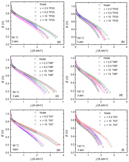 - Matos, B.R.; Santiago, E.I.; Rey, J.F.Q.; Ferlauto, A.S.; Traversa, E.; Linardi, M.; Fonseca, F.C. Nafion-based composite electrolytes for proton exchange membrane fuel cells operating above 120 °C with titania nanoparticles and nanotubes as fillers. J. Power Sources 2011, 196, 1061–1068. [Google Scholar] [CrossRef]